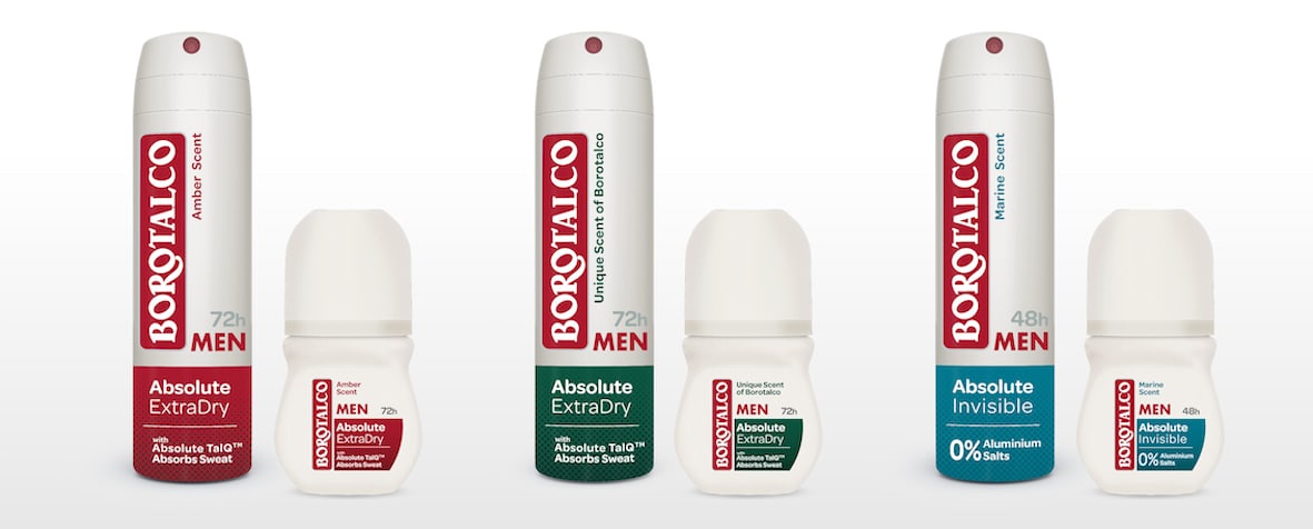 Neu auf den Markt kommen unter dem Namen „Borotalco Men Absolute“ zwei unterschiedliche Linien (jeweils Spray und Roll-on): Die „Absolute Extra Dry“-Deodorants (in zwei Duftrichtungen) versprechen maximale Schweißabsorbierung und 72 Stunden effektiven Deo-Schutz. „Absolute Invisible“ ohne Antitranspirantien und ohne Puder bietet 48 Stunden Deo-Schutz und hinterlässt dabei keinerlei weiße Spuren auf Körper oder Kleidung. Die speziell entwickelte Absolute TalQ-Technologie – eine exklusive Mischung aus drei absorbierenden, natürlichen, mineralischen Pudern – sorgt für ein trockenes und gepflegtes Hautgefühl.