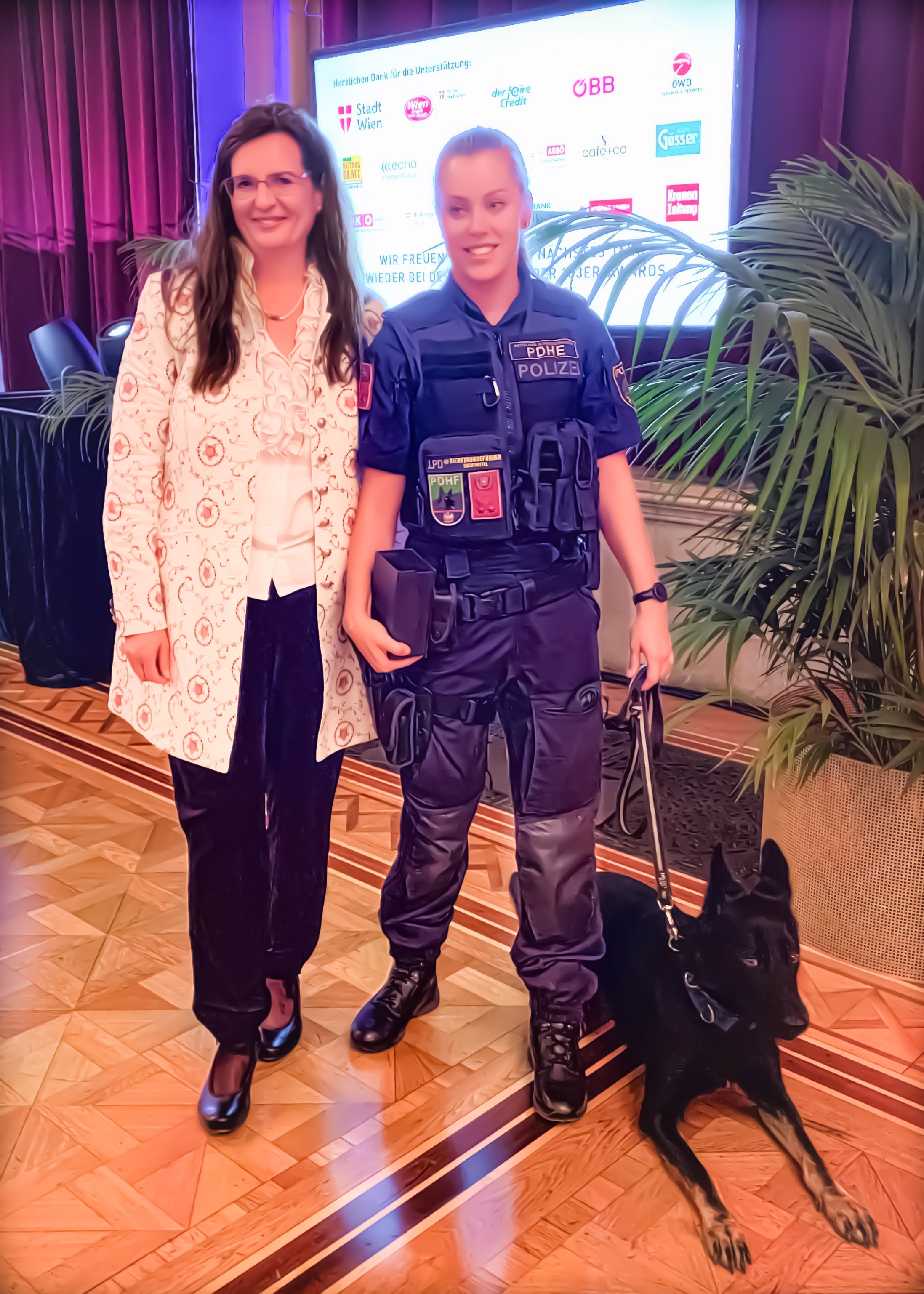 Für den dreijährigen Schäferhund ist Revierinspektor Marie Luise Gawlik zuständig, sie übernahm von Brau Union Geschäftsleiterin Dr. Gabriela Straka die Auszeichnung der Wiener Polizei 2021.