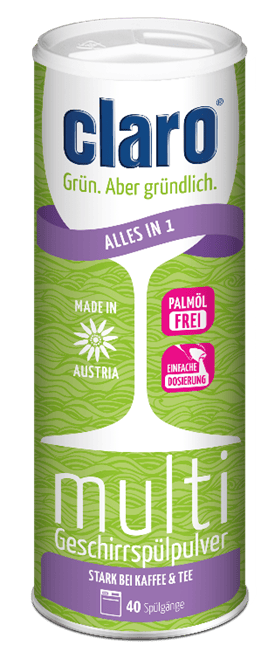 Nach mehreren Meilensteinen im Bereich des maschinellen Geschirrspülens greift claro jetzt einen weiteren Trend auf und geht den nächsten Schritt: Ergänzend zum bewährten „claro Classic Pulver“ bringt das Salzburger Unternehmen jetzt ein multi Geschirrspülpulver auf den Markt. Ähnlich wie die bekannten Multifunktions-Tabs verfügt auch das All-in-one Pulver über eine integrierte Salz- und Klarspülfunktion, wodurch eine perfekte Reinigungsleistung und strahlend sauberes Geschirr garantiert wird. Dabei lässt sich das Pulver in der praktischen Dose einfach und exakt dosieren, der Inhalt reicht für 40 Spülgänge. Vorerst erhältlich im Claro Online-Shop.
