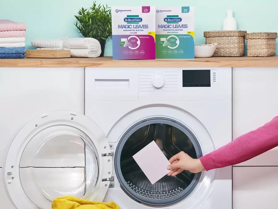 Mit Magic Leaves unterstreicht Dr. Beckmann sein Credo für den Werterhalt von Kleidung durch zielgerichtete Wäschepflege. Magic Leaves wirken bereits bei niedrigen, energiesparenden Temperaturen ab 20 Grad. Mit einem Leichtgewicht von 100 Gramm bei 25 Waschmittelblättern pro Packung erzielen Magic Leaves eine Gesamtwaschleistung von bis zu 112,5 Kilogramm Wäsche. Im Vergleich zu Flüssigwaschmitteln in Plastikflaschen mit vergleichbaren Waschladungen hat die kompakte Magic Leaves Verpackung bis zu 80 Prozent weniger Verpackung und benötigt weniger Platz, was beim Transport CO2 Emissionen eingespart.
