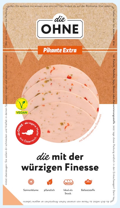Ab sofort können sich nun auch Veganer am kompletten Sortiment erfreuen – denn im Zuge eines umfassenden Relaunches wurden die bisherigen, zum Teil noch vegetarischen Rezepturen zu 100 % auf pflanzliche Zutaten umgestellt. Damit umfasst das Angebot neben veganen Convenience-Produkten wie Nuggets und Filets sowie Frankfurter Würstel jetzt auch ausschließlich vegane Aufschnitt-Produkte wie Extra Klassik, Pikante Extra, Chili Extra, Gurkerl Extra und Extra Kranzl. Und mit den veganen Almscheiben in zwei Sorten bietet die Ohne darüber hinaus auch eine rein pflanzliche Alternative zu Käse.