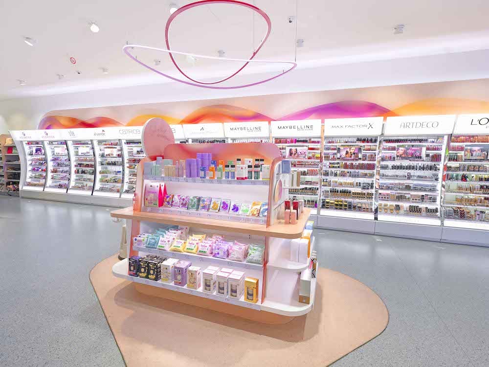 Die laufende Vergrößerung der durchschnittlichen Verkaufsflächen und die Gestaltung klar strukturierter Sortimentszonen sorgen für Orientierung. Niedrige Regale mit einer Höhe von 1,40 Metern ermöglichen einen freien Blick durch die offenen Räume, während weiche Linien und ein Wechsel aus warmen und kalten Lichttönen ein noch entspannteres und übersichtlicheres Einkaufserlebnis schaffen. Besonders ins Auge fällt das Beauty-Dreieck, ein zentrales Inspirationsmöbel, das mit Neuheiten, Bestsellern und abgestimmten Beleuchtungselementen zum Entdecken einlädt. Auch Außen tut sich was: Die Fassaden der Filialen erstrahlen in bunten, lebendigen Farben.