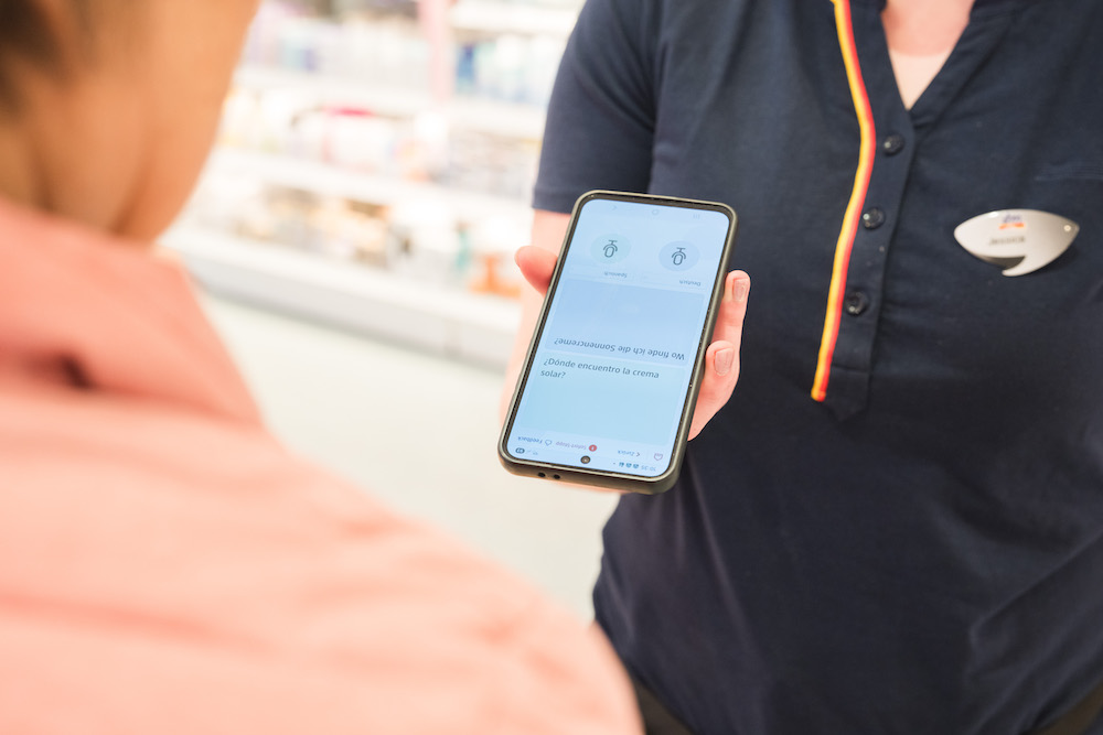 Die Anwendung läuft auf Smartphones, die von den Mitarbeitenden in den Märkten genutzt werden. Der Kunde und der Mitarbeitende können das Display gleichzeitig einsehen. Auf der jeweiligen Seite wird das Gesprochene direkt in der gewünschten Sprache als übersetzter Text angezeigt. So können Fragen und Anliegen einfach, verständlich und im persönlichen Kontakt geklärt werden – auch dann, wenn keine gemeinsame Sprache vorhanden ist.