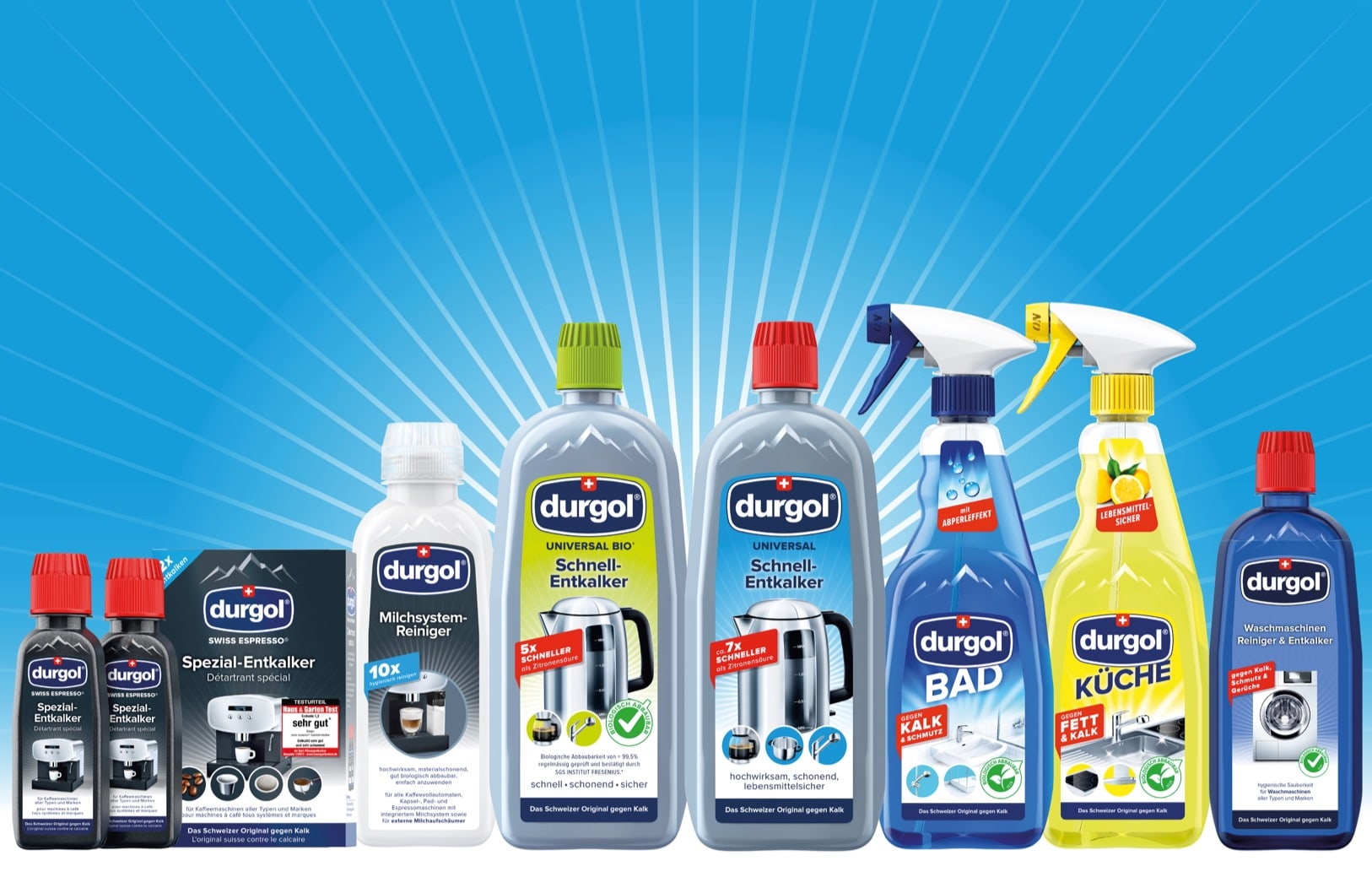 Die verschiedenen Universal- und Spezial-Produkte von durgol können für die fachgerechte Entkalkung und Reinigung von Kaffeemaschinen, Wasserkocher, Dampfgarern, Duschen, Armaturen und neuerdings auch Waschmaschinen eingesetzt werden. Anwendungsspezifische und materialschonende Spezial-Entkalkungsmittel wie der durgol Waschmaschinen Reiniger und Entkalker, durgol swiss espresso und der durgol Milchsystem-Reiniger stellen für das jeweilige Haushaltgerät das perfekt passende Produkt dar. Und auch der durgol Bad-Reiniger und Küchen-Reiniger gehen kraftvoll gegen Schmutz, Fett und Kalk vor.