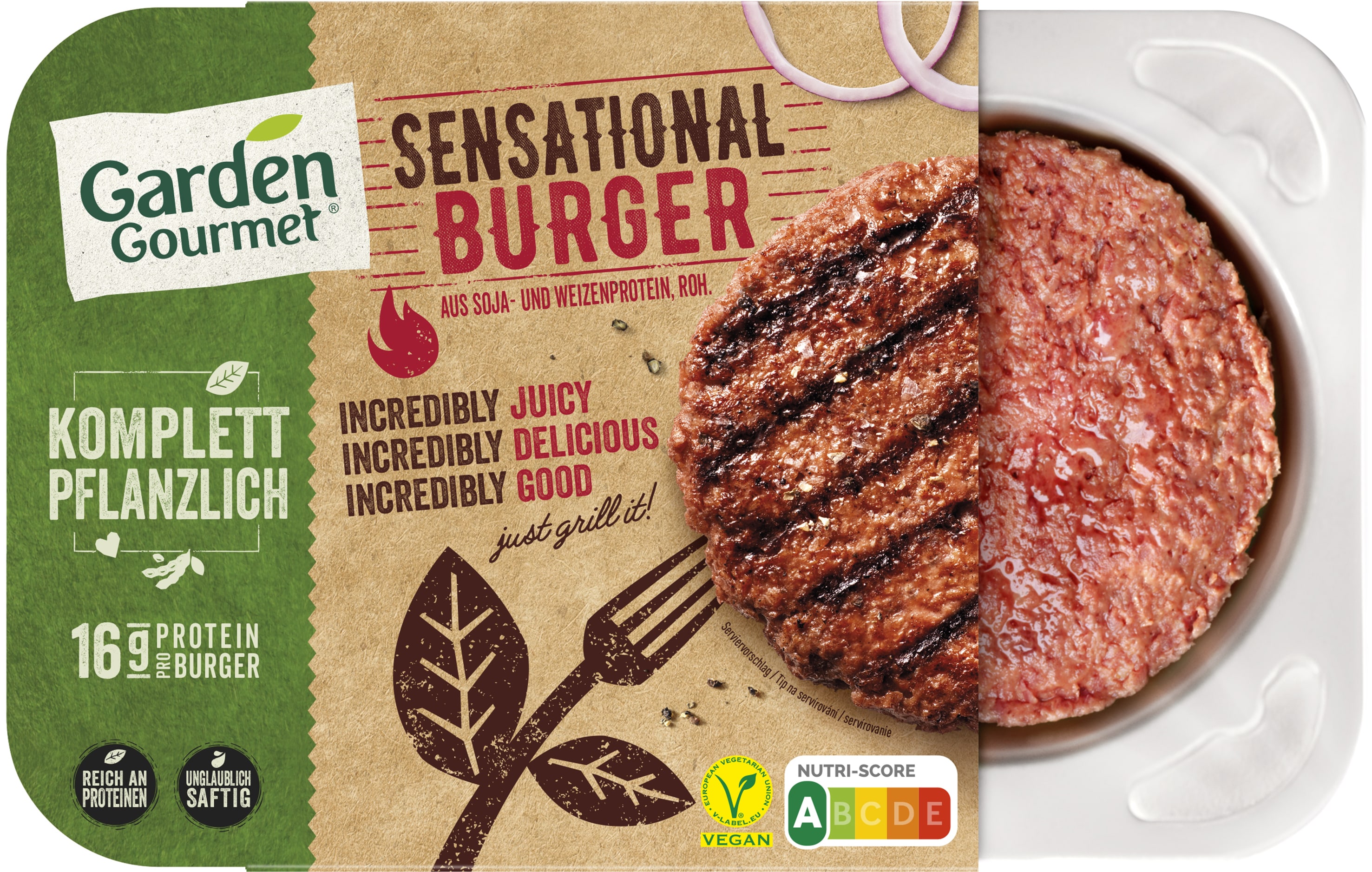 Mit dem Sensational Burger läutet Garden Gourmet, eine der größten Marken für vegetarische Fleischalternativen, eine neue Generation der fleischlosen Burger-Patties ein. Der Veggie-Burger hat den charakteristisch würzigen Geschmack, die saftige Konsistenz und auch das Aussehen eines frischen, rohen Beefburgers und bietet somit das volle "Fleischerlebnis" von der Zubereitung bis zum Verzehr. Selbst Fleischtiger werden den Unterschied zu einem traditionellen Beef-Patty kaum bemerken. Der innovative Garden Gourmet Sensational Burger ist zu 100 % pflanzlich und enthält Protein aus Soja und Weizen. Die Marke Garden Gourmet hat über 30 Jahre Erfahrung in die Entwicklung dieses saftigen Pflanzenburgers eingebracht. Mit nur 183 kcal sowie mit 17 g Eiweiß, 9,2 g Fett, 5 g Ballaststoffen und 1 g Salz pro 100 g bietet der vegane Burger neben gutem Geschmack auch gleichzeitig einen Beitrag zu einer ausgewogenen Ernährung. Die Herstellung aus Pflanzen statt Tieren erfordert zudem um ein Vielfaches weniger Ressourcen. Zu finden ist der Burger im gekühlten Veggie-Regal.