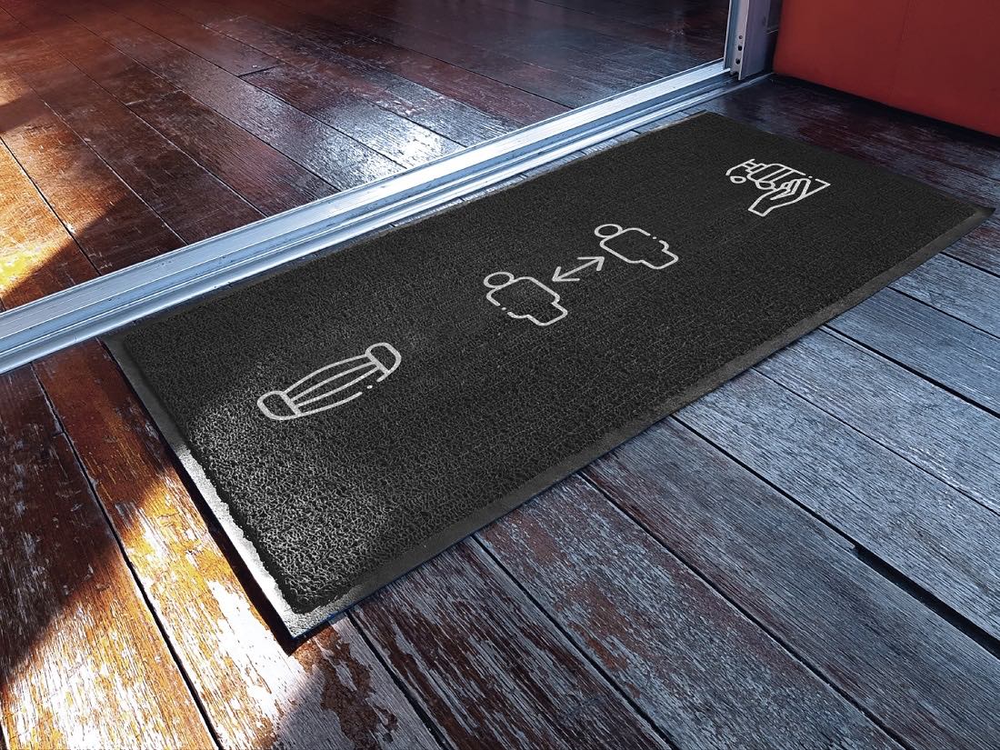 Praktisch ohne Umschweife: Beim Betreten eines Geschäftes wird man anhand der Mewa Fußmatten direkt auf die erforderlichen Hygienemaßnahmen hingewiesen. Bedruckt mit Bildern zu Mund-Nasen-Schutz, Händedesinfektion oder 1,50 Meter-Abstandspfeilen erinnern die Matten gleich an der Tür an achtsames Verhalten. Damit sind die Matten von Mewa Textil-Service dreifach hilfreich: als Abstandshalter, Schmutzfang und Hinweisgeber in einem Produkt. Durch eine spezielle Rückseitenbeschichtung liegen sie faltenfrei und rutschsicher auf dem Boden.