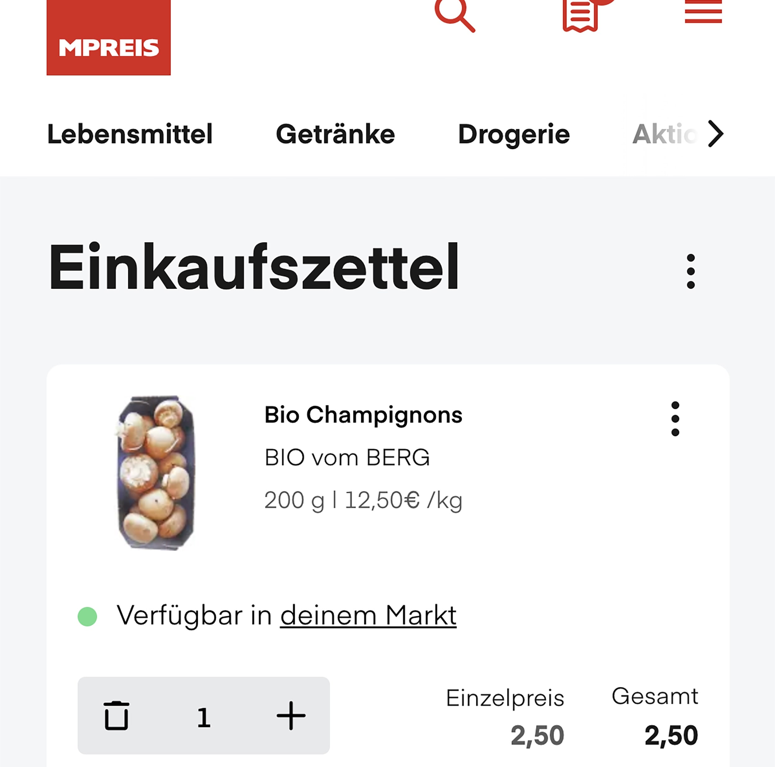 Der Online Shop mit Zustellservice war bis vor kurzem unter einer separaten Internet Adresse erreichbar. Jetzt gelangt man von der neuen Homepage direkt zu den Produkten und mit einem Klick in den Onlineshop. Die Produkte lassen sich auf einen virtuellen Einkaufszettel setzen. Nach Auswahl der Filiale ist sogleich ersichtlich, ob der gesuchte Artikel dort vorrätig ist. Der Einkaufszettel ist so intelligent, dass diese gleich nach Kategorie sortiert werden. Entweder man bestellt online oder nimmt diesen als Checkliste auf dem Handy mit in den Markt.
