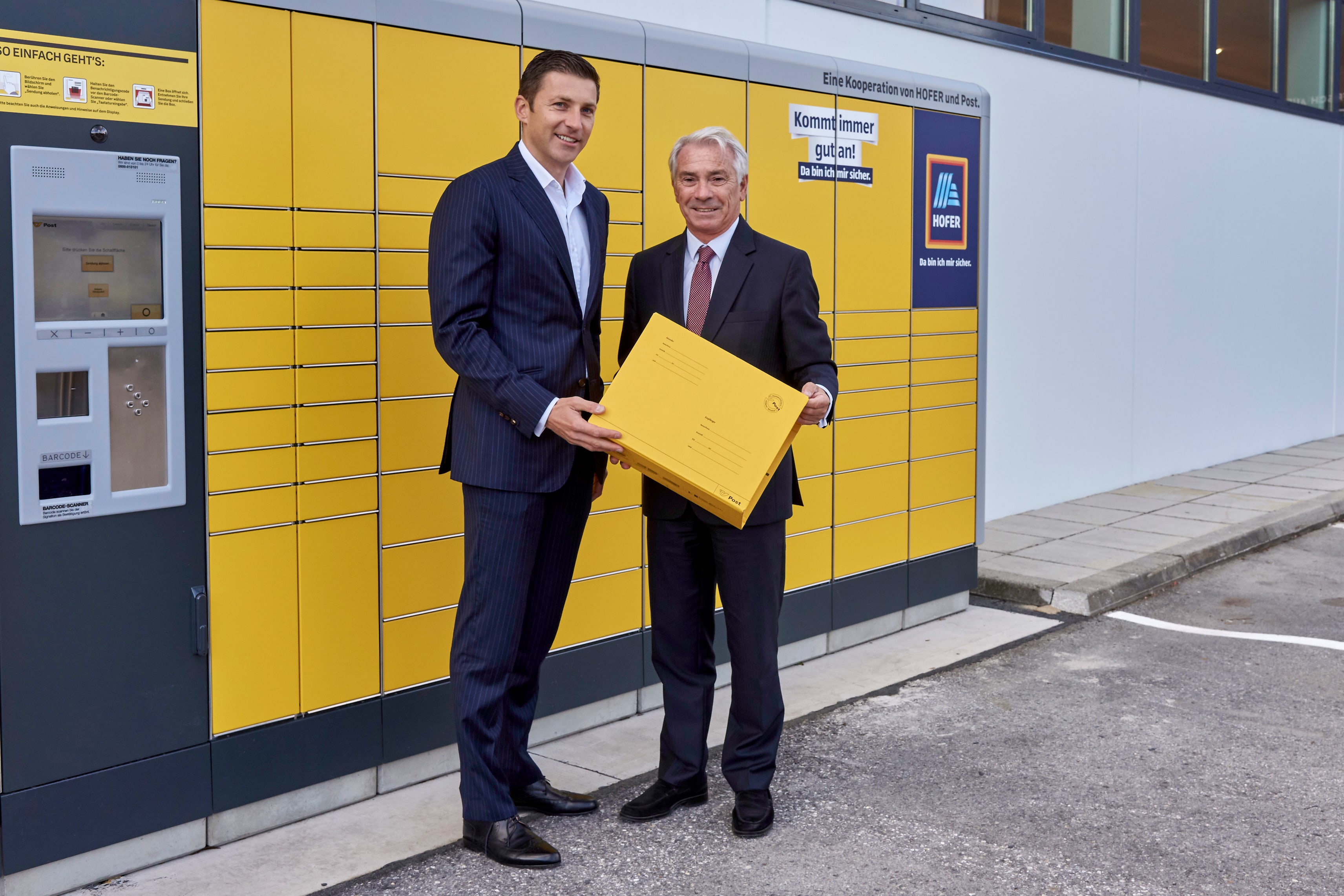 „Wird das vorerst als Pilotbetrieb gestartete Projekt gut angenommen, soll das Service österreichweit ausgerollt werden“, so DI Dr. Georg Pölzl, Generaldirektor der Österreichischen Post AG, und Dr. Günther Helm, Generaldirektor der Hofer KG, bei der gemeinsamen Inbetriebnahme der ersten Post-Station bei der Hofer-Filiale in der Linzer Straße 455, 1140 Wien.