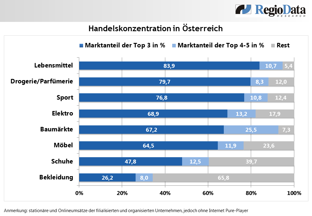 Im Lebensmitteleinzelhandel ist – sowohl durch Übernahmen, als auch durch eigene Expansion – der Konzentrationsgrad in den letzten Jahren stetig gestiegen und nun im Branchenvergleich deutlich am höchsten. International gesehen werden nur in Finnland, Norwegen und Schweden ähnliche Konzentrationsgrade gemessen. Rewe, Spar und Hofer kommen als Top 3 zusammen auf knapp 84 % Marktanteil, weshalb sie für ihre Lieferanten unverzichtbar geworden sind. Denn die hohe Marktkonzentration hat bekanntermaßen auch Konsequenzen für die Markenartikelhersteller. Wird ein neues Produkt bei REWE und/oder Spar nicht gelistet, hat es kaum Chancen, in Österreich erfolgreich zu sein. Andererseits entstehen durch Oligopole auch immer wieder Chancen für Nischenanbieter, etwa für Ethnogeschäfte oder Bio-Supermärkte.