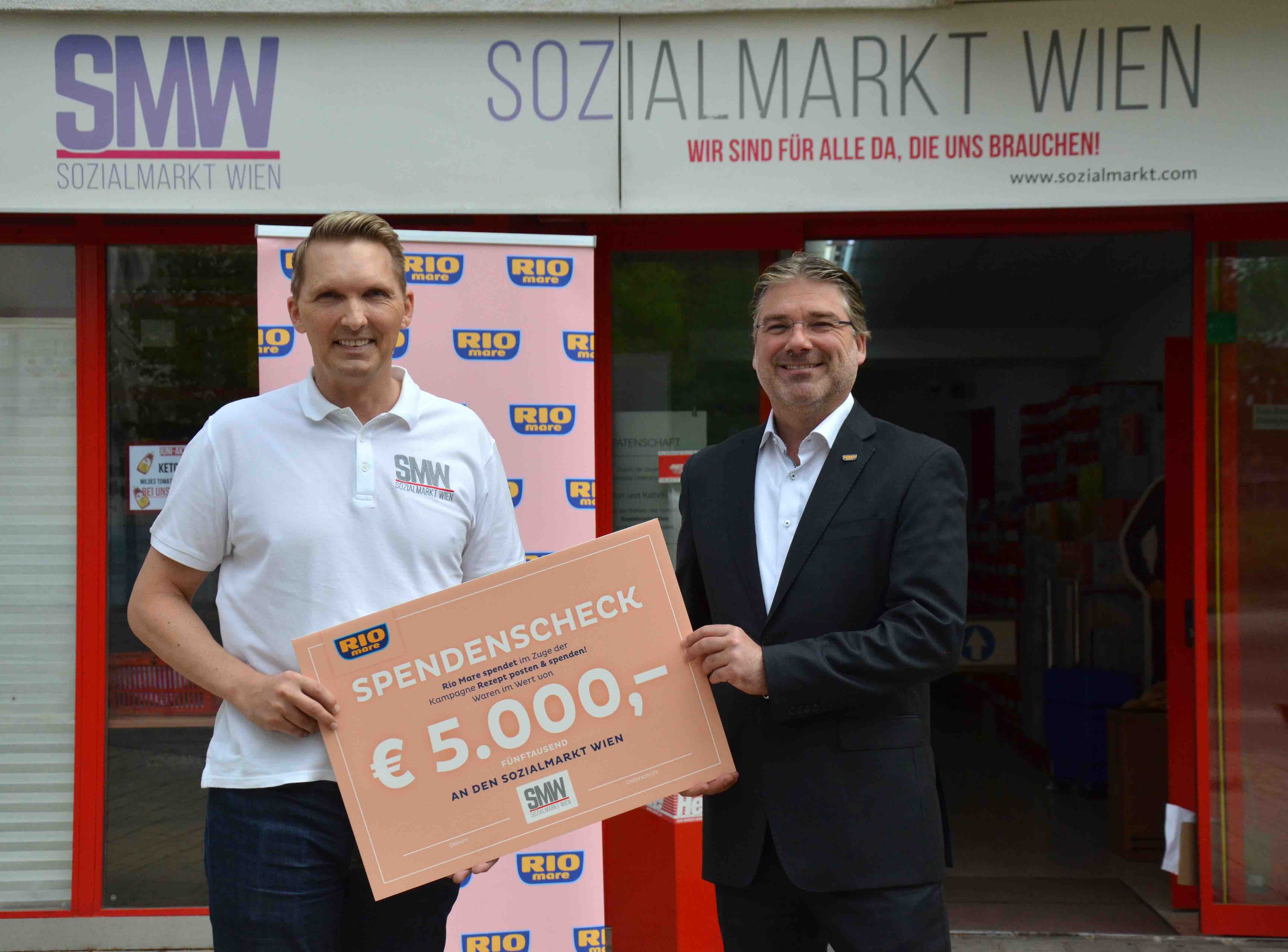 Im Rahmen einer Charityaktion hat Rio Mare in den vergangenen Wochen dazu aufgerufen, unter dem Hashtag #stayhomewithriomare ein Rezept zu posten. Für jedes gepostete Rezept spendete Rio Mare Ware im Wert von 10 Euro an den Sozialmarkt Wien. Dank der begeisterten Köchinnen und Köche zuhause konnten 5000 Euro gesammelt werden und Rio Mare einen Spendencheck an Alexander Schiel, den Geschäftsführer der drei Sozialmärkte Wien, übergeben.