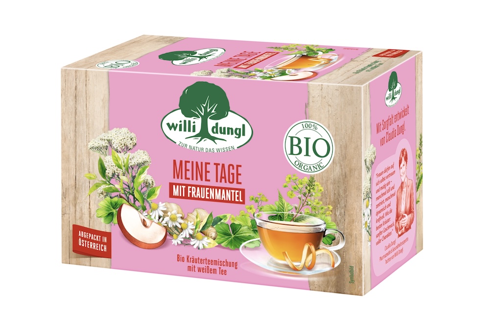Speziell für die Zeit der Menstruation wurde die Bio-Teemischung willi dungl Meine Tage entwickelt, die auf einem ausgewogenen Kräutermix und weißem Tee basiert. Frauenmantel, Schafgarbenblüten und Kamille verbinden sich mit der frischen Note von Zitronenverbene, fruchtigem Apfel und zarten Orangenschalen, abgerundet mit würzigem Ingwer. Der Tee wird aus rein biologischen Zutaten hergestellt und überzeugt geschmacklich mit einem spannenden Mix aus Kräuter- und Fruchtnoten.
