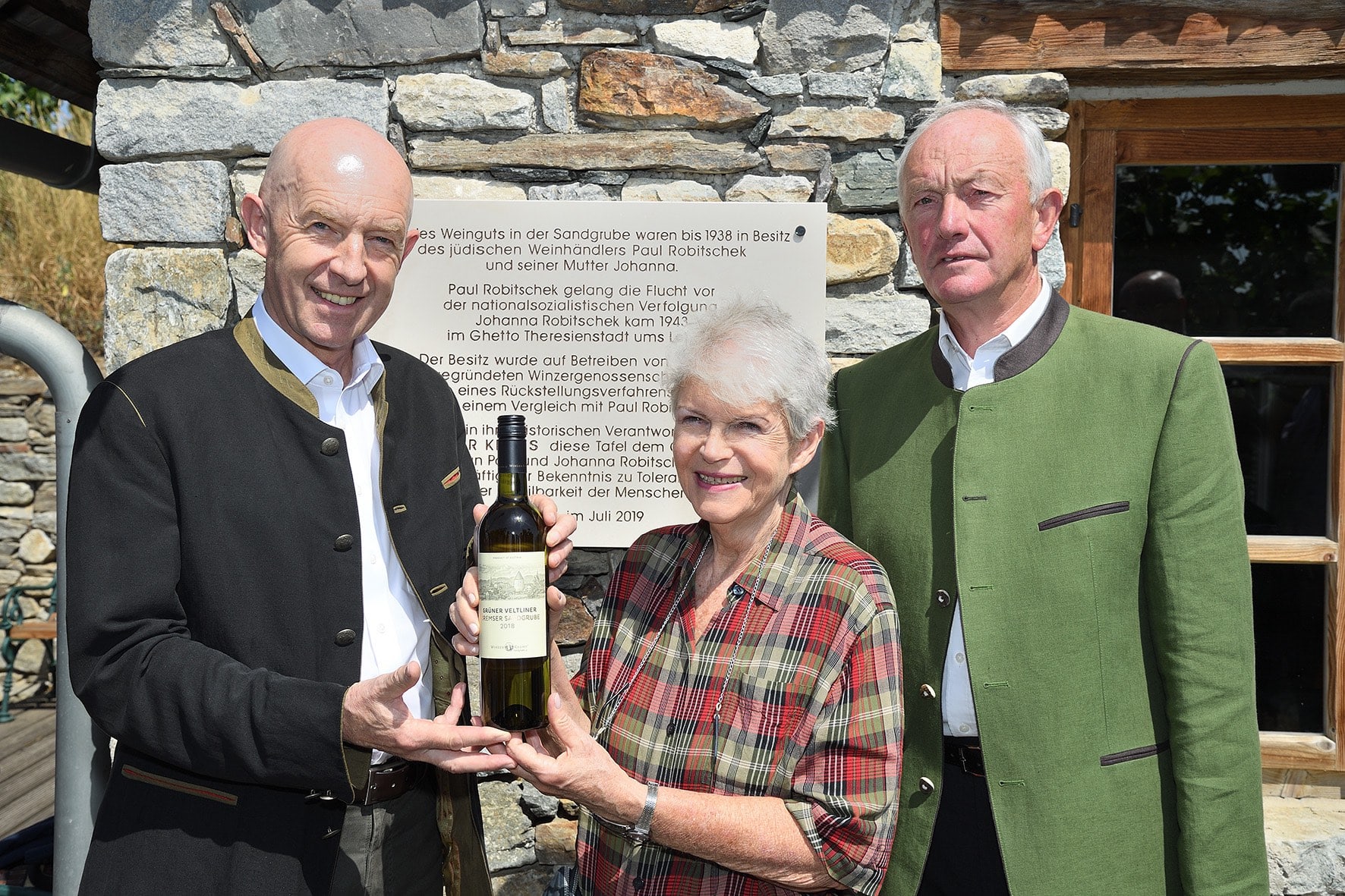Franz Bauer, der Obmann der Winzer Krems und Geschäftsführer Franz Ehrenleitner haben bei der Historikerin Brigitte Bailer-Gananda die lückenlose, wissenschaftliche Aufarbeitung der Ereignisse rund um die Gründung ihrer Genossenschaft in Auftrag gegeben und damit einen beispielhaften Akt der Vergangenheitsbewältigung gesetzt. Am 2. Juli wurden die Ergebnisse am Firmensitz der Winzer Krems in der Sandgrube präsentiert. Mit der Enthüllung einer Gedenktafel in Erinnerung an Paul und Johanna Robitschek, die früheren Eigentümer der Kellerei, setzt die WG Krems nach über 80 Jahren ein Zeichen der historischen Aufarbeitung eines unrühmlichen Kapitels ihrer Firmengeschichte.